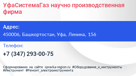 Для связи с организацией воспользуйтесь номером телефона: +7 (347) 293-00-75. Пн: c 09:00-18:00, Вт: c 09:00-18:00, Ср: c 09:00-18:00, Чт: c 09:00-18:00, Пт: c 09:00-18:00, Сб: выходной, Вс: выходной, вы можете обратиться в эту организацию.