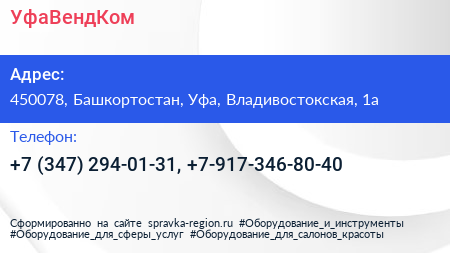 УфаВендКом по адресу 450078, Башкортостан, Уфа, Владивостокская, 1а в дальнейшем Организация, размещена в следующих категориях: