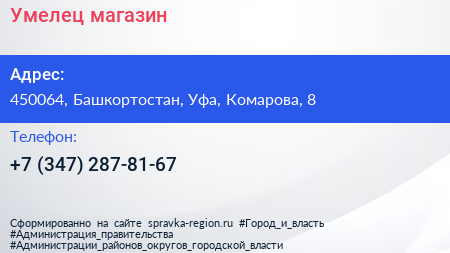 Умелец, магазин по адресу 450064, Башкортостан, Уфа, Комарова, 8 в дальнейшем Организация, размещена в следующих категориях:
