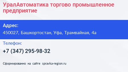 УралАвтоматика, торгово-промышленное предприятие по адресу 450027, Башкортостан, Уфа, Трамвайная, 4а в дальнейшем Организация, размещена в следующих категориях: