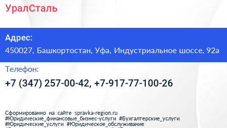 УралСталь по адресу 450027, Башкортостан, Уфа, Индустриальное шоссе, 92а в дальнейшем Организация, размещена в следующих категориях: