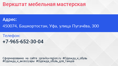 Веркштат, мебельная мастерская по адресу 450074, Башкортостан, Уфа, улица Пугачёва, 300 в дальнейшем Организация, размещена в следующих категориях: