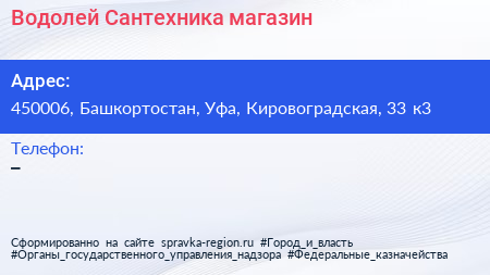 Водолей-Сантехника, магазин по адресу 450006, Башкортостан, Уфа, Кировоградская, 33 к3 в дальнейшем Организация, размещена в следующих категориях: