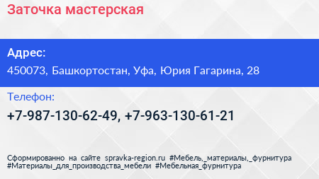 Заточка, мастерская по адресу 450073, Башкортостан, Уфа, Юрия Гагарина, 28 в дальнейшем Организация, размещена в следующих категориях: