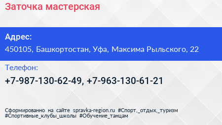 Заточка, мастерская по адресу 450105, Башкортостан, Уфа, Максима Рыльского, 22 в дальнейшем Организация, размещена в следующих категориях: