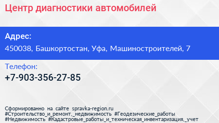 Центр диагностики автомобилей по адресу 450038, Башкортостан, Уфа, Машиностроителей, 7 в дальнейшем Организация, размещена в следующих категориях: