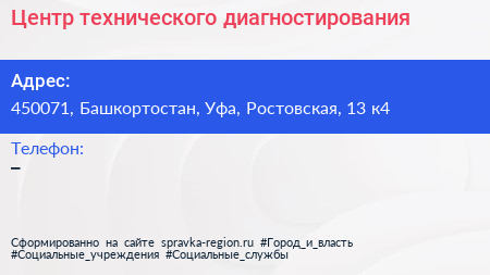 Центр технического диагностирования по адресу 450071, Башкортостан, Уфа, Ростовская, 13 к4 в дальнейшем Организация, размещена в следующих категориях: