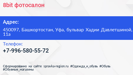 8bit, фотосалон по адресу 450097, Башкортостан, Уфа, бульвар Хадии Давлетшиной, 11а в дальнейшем Организация, размещена в следующих категориях: