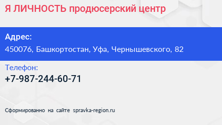 Я-ЛИЧНОСТЬ, продюсерский центр по адресу 450076, Башкортостан, Уфа, Чернышевского, 82 в дальнейшем Организация, размещена в следующих категориях: