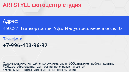 ARTSTYLE, фотоцентр-студия по адресу 450027, Башкортостан, Уфа, Индустриальное шоссе, 37 в дальнейшем Организация, размещена в следующих категориях: