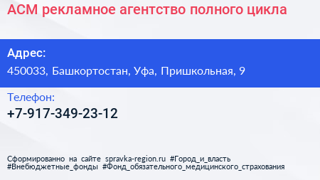 АСМ, рекламное агентство полного цикла по адресу 450033, Башкортостан, Уфа, Пришкольная, 9 в дальнейшем Организация, размещена в следующих категориях: