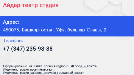 Айдар, театр-студия по адресу 450075, Башкортостан, Уфа, бульвар Славы, 2 в дальнейшем Организация, размещена в следующих категориях: