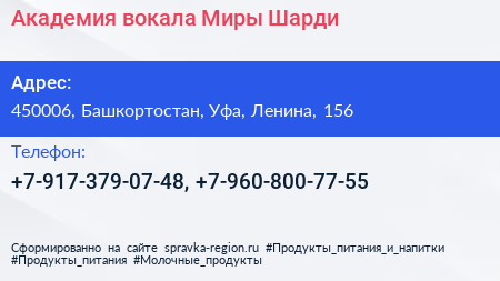 Академия вокала Миры Шарди по адресу 450006, Башкортостан, Уфа, Ленина, 156 в дальнейшем Организация, размещена в следующих категориях: