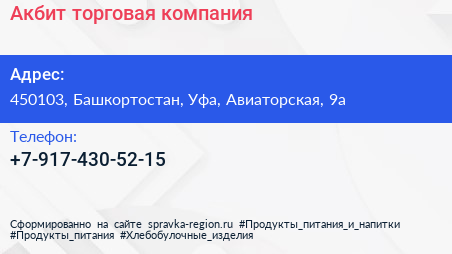 Акбит, торговая компания по адресу 450103, Башкортостан, Уфа, Авиаторская, 9а в дальнейшем Организация, размещена в следующих категориях: