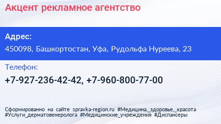 Акцент, рекламное агентство по адресу 450098, Башкортостан, Уфа, Рудольфа Нуреева, 23 в дальнейшем Организация, размещена в следующих категориях: