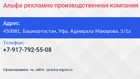 Альфа, рекламно-производственная компания по адресу 450081, Башкортостан, Уфа, Адмирала Макарова, 5/1а в дальнейшем Организация, размещена в следующих категориях: