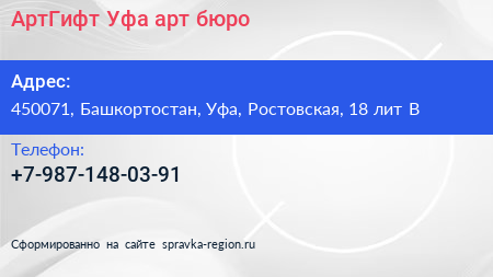 АртГифт Уфа, арт-бюро по адресу 450071, Башкортостан, Уфа, Ростовская, 18 лит В в дальнейшем Организация, размещена в следующих категориях: