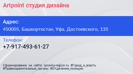 Artpoint, студия дизайна по адресу 450005, Башкортостан, Уфа, Достоевского, 135 в дальнейшем Организация, размещена в следующих категориях: