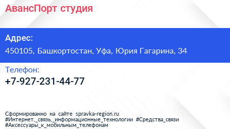 АвансПорт, студия по адресу 450105, Башкортостан, Уфа, Юрия Гагарина, 34 в дальнейшем Организация, размещена в следующих категориях: