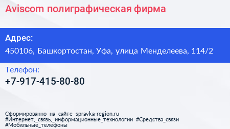 Aviscom, полиграфическая фирма по адресу 450106, Башкортостан, Уфа, улица Менделеева, 114/2 в дальнейшем Организация, размещена в следующих категориях: