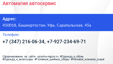 Автомагия, автосервис по адресу 450018, Башкортостан, Уфа, Сарапульская, 45а в дальнейшем Организация, размещена в следующих категориях: