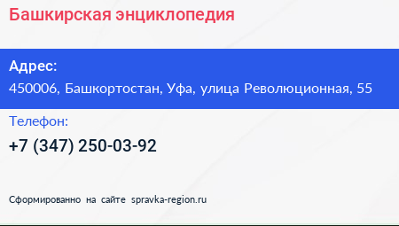 Башкирская энциклопедия по адресу 450006, Башкортостан, Уфа, улица Революционная, 55 в дальнейшем Организация, размещена в следующих категориях: