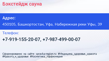 Бэкстейдж, сауна по адресу 450105, Башкортостан, Уфа, Набережная реки Уфы, 39 в дальнейшем Организация, размещена в следующих категориях:
