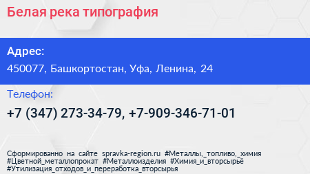 Белая река, типография по адресу 450077, Башкортостан, Уфа, Ленина, 24 в дальнейшем Организация, размещена в следующих категориях: