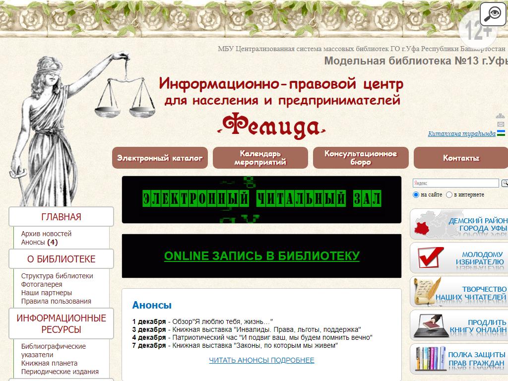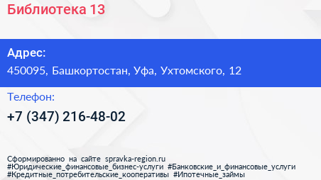 Библиотека №13 по адресу 450095, Башкортостан, Уфа, Ухтомского, 12 в дальнейшем Организация, размещена в следующих категориях: