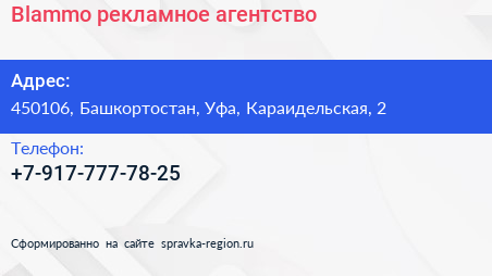 Blammo, рекламное агентство по адресу 450106, Башкортостан, Уфа, Караидельская, 2 в дальнейшем Организация, размещена в следующих категориях: