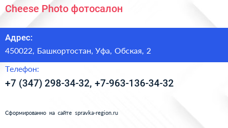 Cheese Photo, фотосалон по адресу 450022, Башкортостан, Уфа, Обская, 2 в дальнейшем Организация, размещена в следующих категориях: