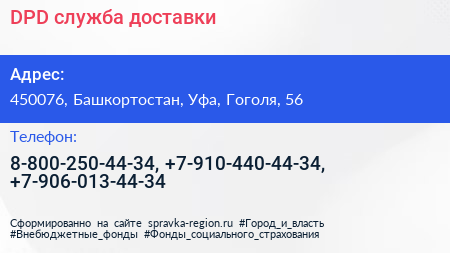 DPD, служба доставки по адресу 450076, Башкортостан, Уфа, Гоголя, 56 в дальнейшем Организация, размещена в следующих категориях: