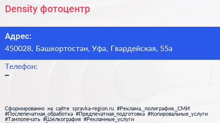 Density, фотоцентр по адресу 450028, Башкортостан, Уфа, Гвардейская, 55а в дальнейшем Организация, размещена в следующих категориях: