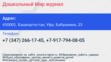 Дошкольный Мир, журнал по адресу 450001, Башкортостан, Уфа, Бабушкина, 23 в дальнейшем Организация, размещена в следующих категориях: