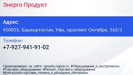 Энерго Продукт по адресу 450055, Башкортостан, Уфа, проспект Октября, 162/1 в дальнейшем Организация, размещена в следующих категориях: