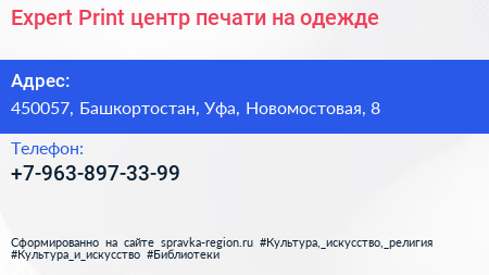 Expert Print, центр печати на одежде по адресу 450057, Башкортостан, Уфа, Новомостовая, 8 в дальнейшем Организация, размещена в следующих категориях: