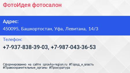 ФотоИдея, фотосалон по адресу 450095, Башкортостан, Уфа, Левитана, 14/3 в дальнейшем Организация, размещена в следующих категориях: