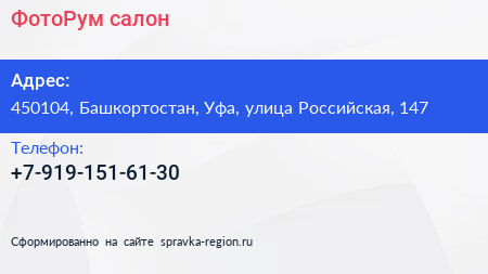 ФотоРум, салон по адресу 450104, Башкортостан, Уфа, улица Российская, 147 в дальнейшем Организация, размещена в следующих категориях: