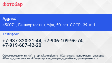Фотобар по адресу 450071, Башкортостан, Уфа, 50 лет СССР, 39 к11 в дальнейшем Организация, размещена в следующих категориях: