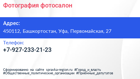 Фотография, фотосалон по адресу 450112, Башкортостан, Уфа, Первомайская, 27 в дальнейшем Организация, размещена в следующих категориях: