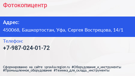 Фотокопицентр по адресу 450068, Башкортостан, Уфа, Сергея Вострецова, 14/1 в дальнейшем Организация, размещена в следующих категориях: