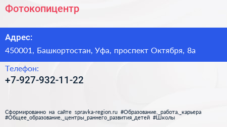 Фотокопицентр по адресу 450001, Башкортостан, Уфа, проспект Октября, 8а в дальнейшем Организация, размещена в следующих категориях: