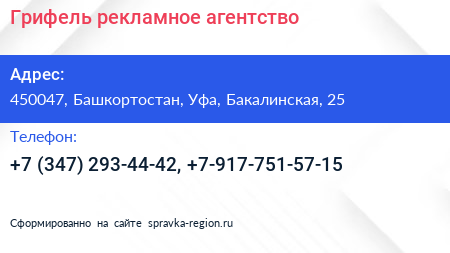 Грифель, рекламное агентство по адресу 450047, Башкортостан, Уфа, Бакалинская, 25 в дальнейшем Организация, размещена в следующих категориях: