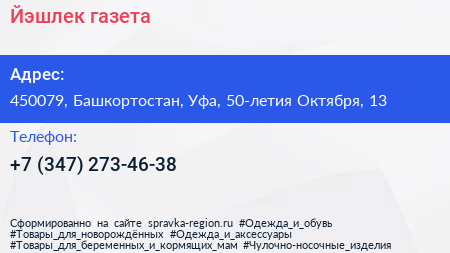 Для связи с организацией воспользуйтесь номером телефона: +7 (347) 273-46-38. Пн: c 09:00-13:00, Вт: c 09:00-13:00, Ср: c 09:00-13:00, Чт: c 09:00-13:00, Пт: c 09:00-13:00, Сб: выходной, Вс: выходной, вы можете обратиться в эту организацию.