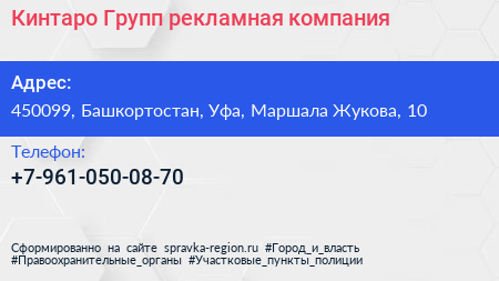 Кинтаро Групп, рекламная компания по адресу 450099, Башкортостан, Уфа, Маршала Жукова, 10 в дальнейшем Организация, размещена в следующих категориях: