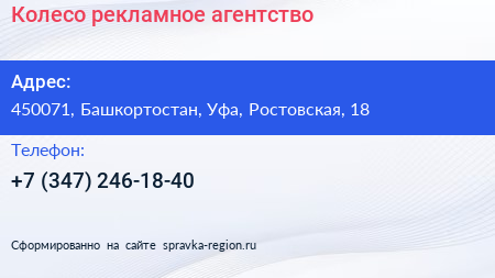 Колесо, рекламное агентство по адресу 450071, Башкортостан, Уфа, Ростовская, 18 в дальнейшем Организация, размещена в следующих категориях: