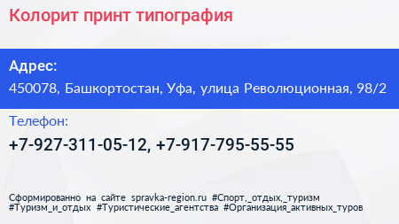 Колорит принт, типография по адресу 450078, Башкортостан, Уфа, улица Революционная, 98/2 в дальнейшем Организация, размещена в следующих категориях: