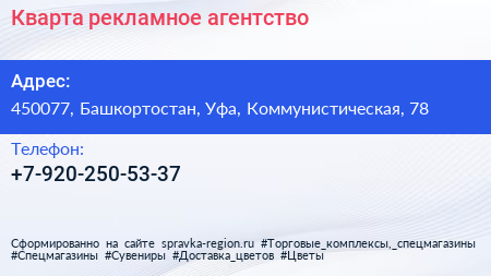 Кварта, рекламное агентство по адресу 450077, Башкортостан, Уфа, Коммунистическая, 78 в дальнейшем Организация, размещена в следующих категориях: