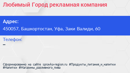Любимый Город, рекламная компания по адресу 450057, Башкортостан, Уфа, Заки Валиди, 60 в дальнейшем Организация, размещена в следующих категориях: