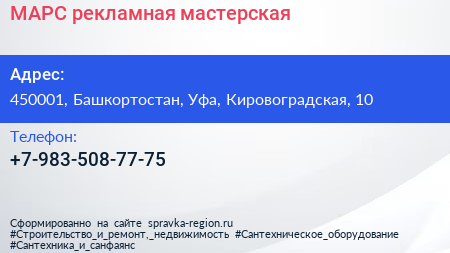 МАРС, рекламная мастерская по адресу 450001, Башкортостан, Уфа, Кировоградская, 10 в дальнейшем Организация, размещена в следующих категориях: